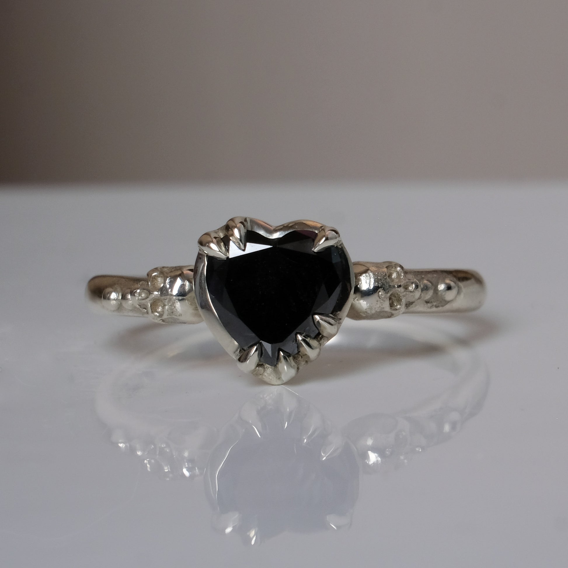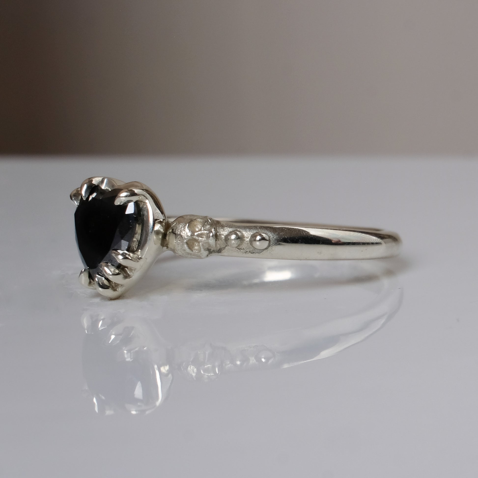 Heart shaped black diamond, claw set and flanked by two tiny skulls.